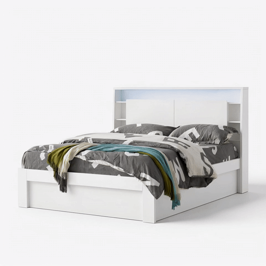 - Bed head with Built-In Shelves: The headboard features built-in shelves on both the left and right sides, offering convenient storage for your books, decor, or nighttime essentials.